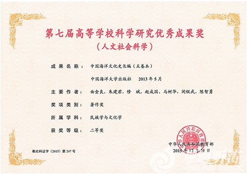 2015年12月10日,《中国海洋文化史长编》(五卷本)获得教育部第七届高等学校科学研究优秀成果奖(人文社会科学)二等奖。