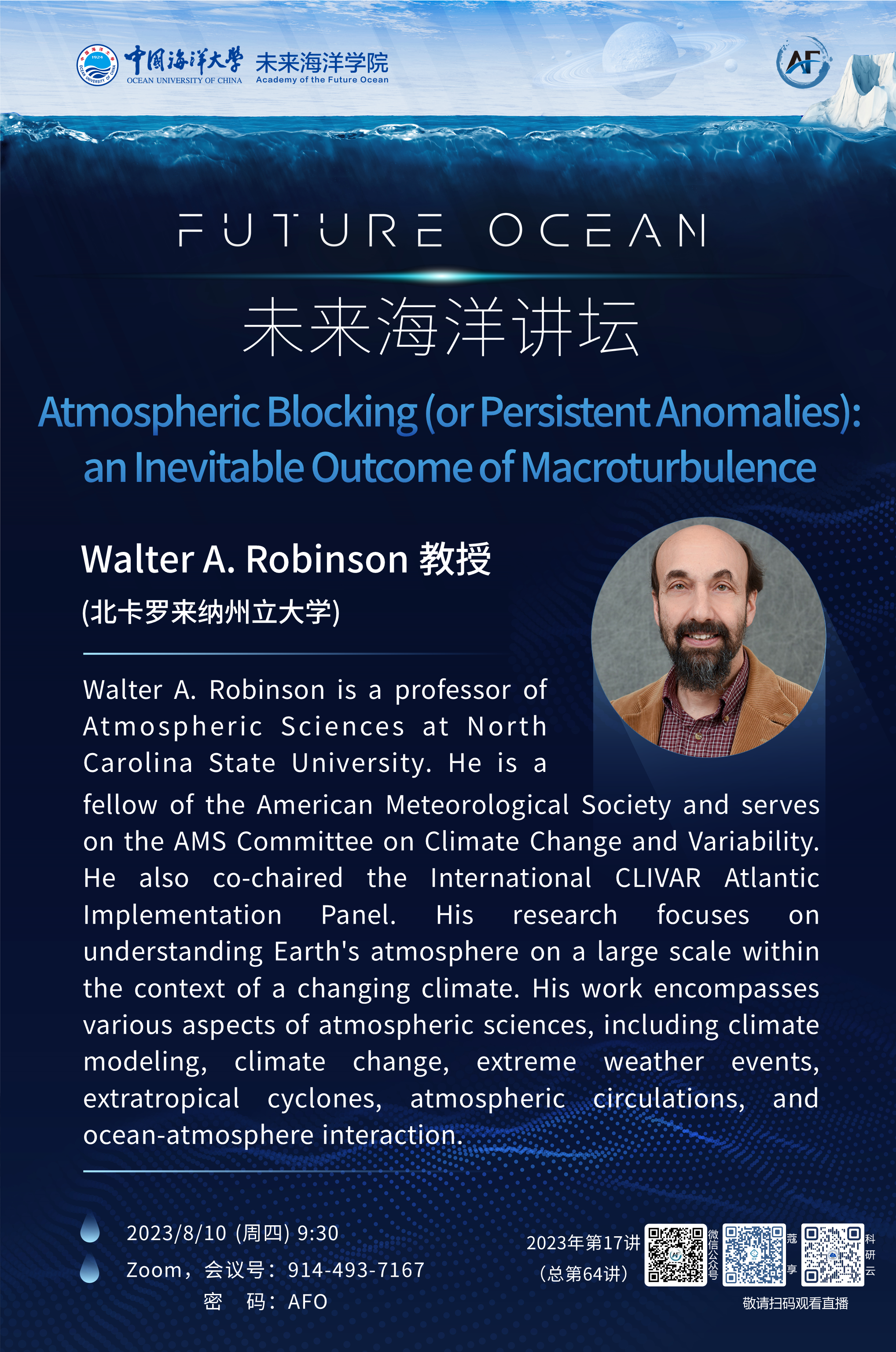 未来海洋讲坛第64讲(2023年第17讲)-Walter A. Robinson:Atmospheric Blocking (or Persistent Anomalies): an Inevitable Outcome of Macroturbulence