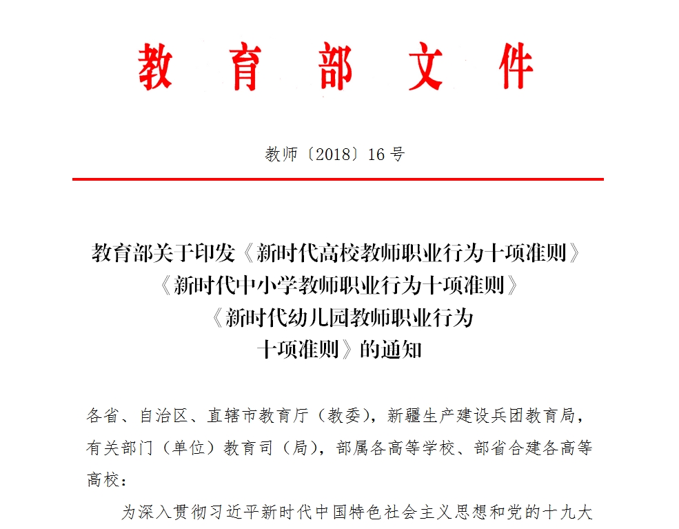 为深入贯彻习近平新时代中国特色社会主义思想和党的十九大精神,深入贯彻落实全国教育大会精神,扎实推进《中共中央 国务院关于全面深化新时代教师队伍建设改革的意见》的实施,进一步加强师德师风建设,我部研究制定了《新时代高校教师职业行为十项准则》《新时代中小学教师职业行为十项准则》《新时代幼儿园教师职业行为十项准则》(以下统称准则)。现印发给你们,请结合实际,认真贯彻执行。