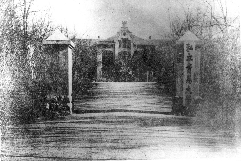 私立青岛大学校门(校门正对的建筑是今天开云电竞网址鱼山校区海洋馆)