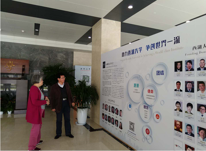 崔维成教授(右)向刘秦玉教授(左)介绍西湖大学