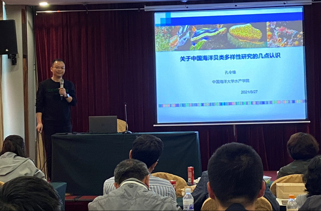 孔令锋老师做了“关于中国海洋贝类多样性研究的几点认识”的报告,从贝类标本馆建设、分类学、类群覆盖、系统发育研究、DNA条形码数据库等不同角度详细介绍了目前我国贝类多样性研究的现状,并结合国际最新研究进展对国内贝类研究今后的工作做了展望。