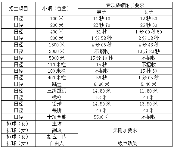 注:考生应持有与报考运动项目一致的运动员技术等级证书(田径小项须严格对应);如考生所在省(自治区、直辖市)组织高水平运动队招生统一测试,则考生必须参加并测试合格;满足专项成绩附加要求的比赛,一般应为获批等级证书的达级赛事或省级(含)以上体育主管部门主办的相关赛事等,跨栏和投掷项目认可国际田联最新田径竞赛规则规定的成人比赛器材规格成绩。