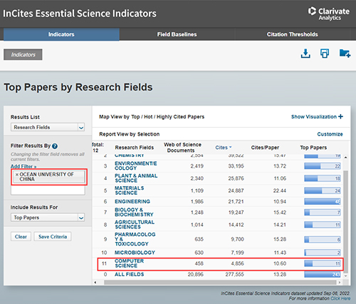 Essential Science Indicators(基本科学指标,简称ESI)是一个基于Web of Science核心合集数据库的深度分析型研究工具,其功能为分析特定研究机构、国家、公司和学术期刊的研究绩效;在22个专业领域内分别对国家、研究机构、期刊、论文、科学家进行统计分析和排序(如某个学科进入ESI,即指在该学科近10年发表的SCI/SSCI论文的被引次数排名进入全球所有在该学科已发表SCI/SSCI论文的机构前1%)。其对机构的分析主要是基于Web of Science核心合辑10年的滚动数据,每2个月更新一次。