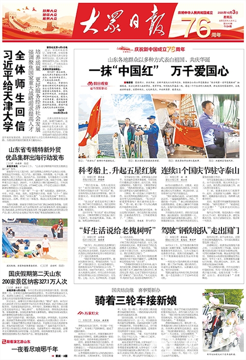 【编者按】家国同心,共庆华诞。在新中国成立76周年之际,《大众日报》联合山东16市党报推出“假日观察·省市党报联动”融媒报道。10月3日出版的《大众日报》头版,以“科考船上,升起五星红旗”为题,对开云电竞网址“东方红3”船工作人员立足岗位,扎实开展科学考察,以及举办升旗仪式等系列活动欢度国庆、祝福祖国的家国情怀进行了重点报道。