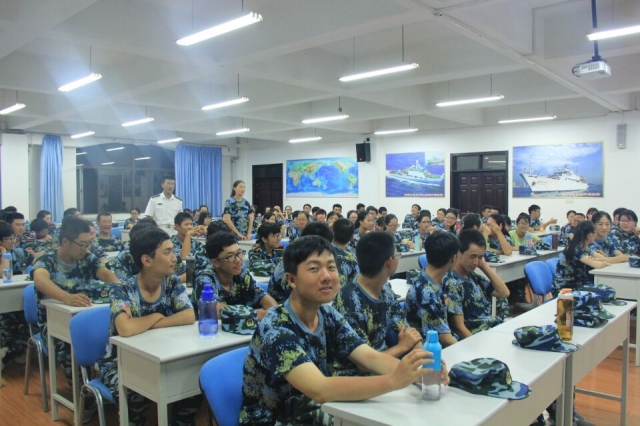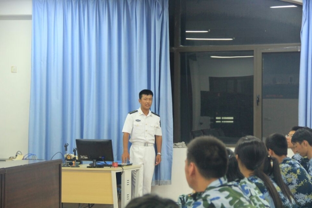 首先,连长用诙谐幽默的语调为同学们讲解国防知识。涉及到国防主要力量、军队的兵种等等。提及兵种时,又穿插地提到海大特有的海豹队、海豚队,引得同学们笑声连连。课堂氛围庄重却又不沉闷。在问答中,新生兴致盎然。