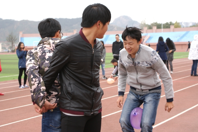 第四个环节——“踩气球”。比赛开始后,大家两两之间用细绳连在一起,统一行动。参赛者们的欢声笑语中时不时夹杂着气球爆裂的声音,场上气氛燃到了至高点。
