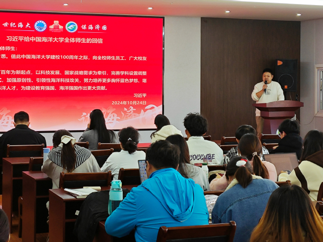 最后,党委副书记刘慧就学习贯彻落实习近平总书记重要回信精神提出三点要求。一是要提高思想认识,把思想和行动统一到重要回信精神上来,准确把握重要回信的丰富内涵、精神实质、核心要义,从习近平总书记重要回信中感悟思想伟力。二是要强化示范带动,掀起学习热潮,依托“三会一课”、主题党日、主题团日、主题班会等载体开展主题明确、形式多样的学习教育活动,确保传达到每一位同学、实现全覆盖;学生骨干要先学一步、深学一层,切实发挥领学促学的示范作用,立足本职尽心做好各项工作。三是要突出实干实效,全面提升自身素质能力,深入了解科技发展前沿动态,适应国家战略和经济社会发展要求,坚定投身海洋强国建设、海洋生态环境领域科研的信念和信心,积极发挥专业在推动社会发展进步中的作用,切实把重要回信精神落到实处。