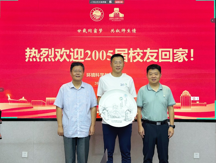 2005届环境科学专业本科班、2005届环境工程专业本科班分别向学院捐赠纪念品,以此表达对母校培育的感恩之情,并祝愿母院未来发展更加辉煌。座谈会后,返校校友参观学院并合影留念。