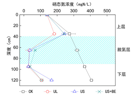 在不同构型反应层条件下的NO3-N垂向分布