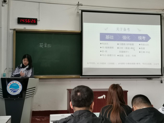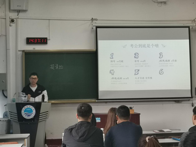 本站讯 为进一步帮助学院学生及早明确学习目标,掌握相关考公技巧,了解更多考公信息,2020年3月25日,食品科学与工程学院于鱼山校区新教0102举行食品学子考公分享会,食品学院30余名学生参与本次分享会。会上邀请到2017级食品科学与工程专业成功上岸的三位考公人——辛诚智、黄汉裕以及冉聆铃向大家进行考公分享,会议由学院辅导员李斐主持。