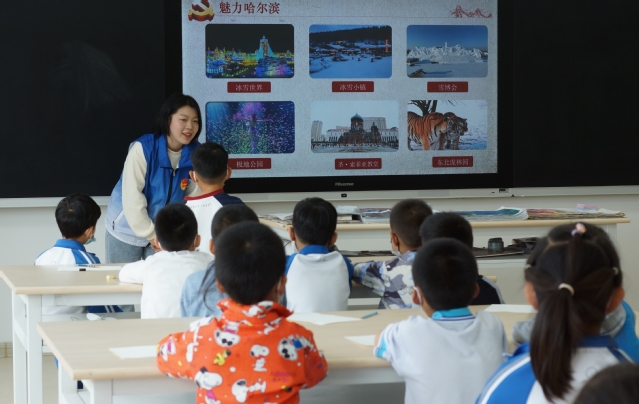 图4.志愿者为学生介绍黑龙江的红色故事
