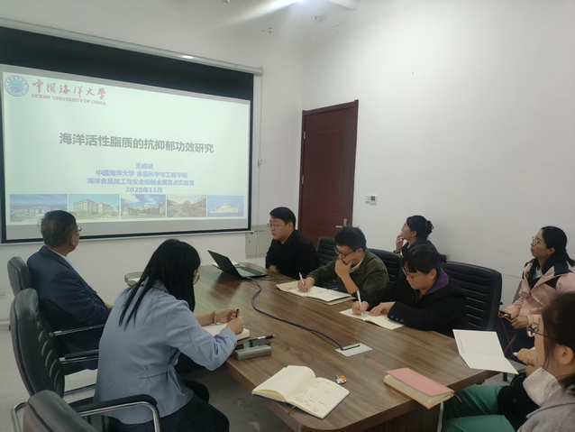 本站讯 11月11日,食品科学与工程学院2025年第五期学术沙龙在食工楼459会议室举行。本期学术沙龙邀请了学院王成成副教授作了题为“海洋活性脂质的抗抑郁功效研究”的精彩报告。学院学术分委员会副主任林洪教授及学院青年教师10余人参加了本期沙龙活动。