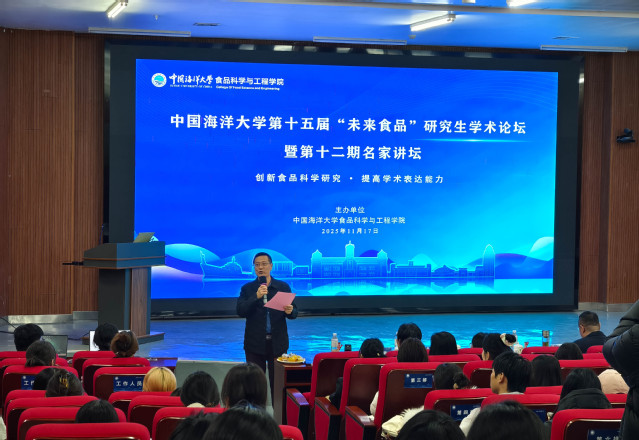 食品科学与工程学院党委书记于德华作总结讲话。他表示,专家报告充分展现了未来食品领域的创新活力,为研究生同学们树立了治学研究的标杆。他勉励食品学子要牢记习近平总书记的殷切嘱托,牢记服务国家战略的使命担当,将个人研究与食品健康、海洋资源开发等国家重大需求紧密结合,努力推动科研成果从实验室走向生产线,真正服务于经济社会发展。