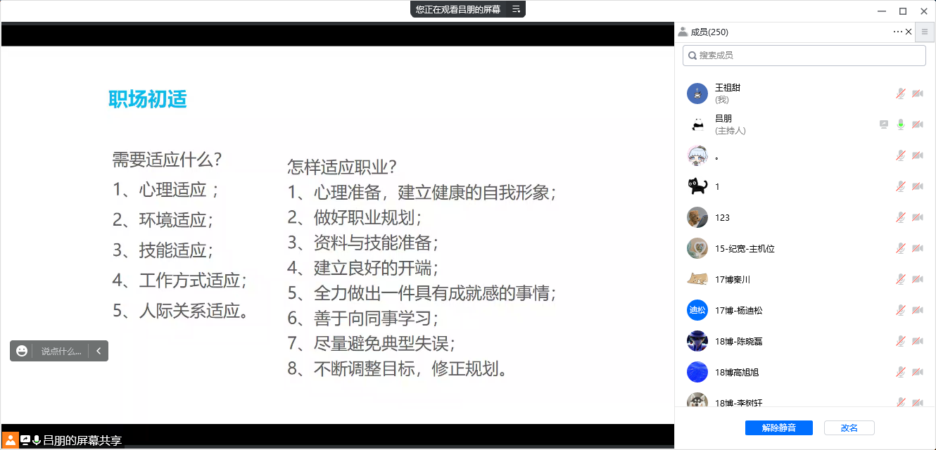 学院团委书记、辅导员吕朋围绕“我和我的海大”主题,带领毕业生重温海大记忆,建议毕业生静静品味最后的海大时光,感恩母校、立志成才,以更加饱满的热情在青春的赛道上奋力奔跑。随后,他以“职场初适”为主题,讲授职业发展教育微课,并对毕业派遣工作进行了说明。