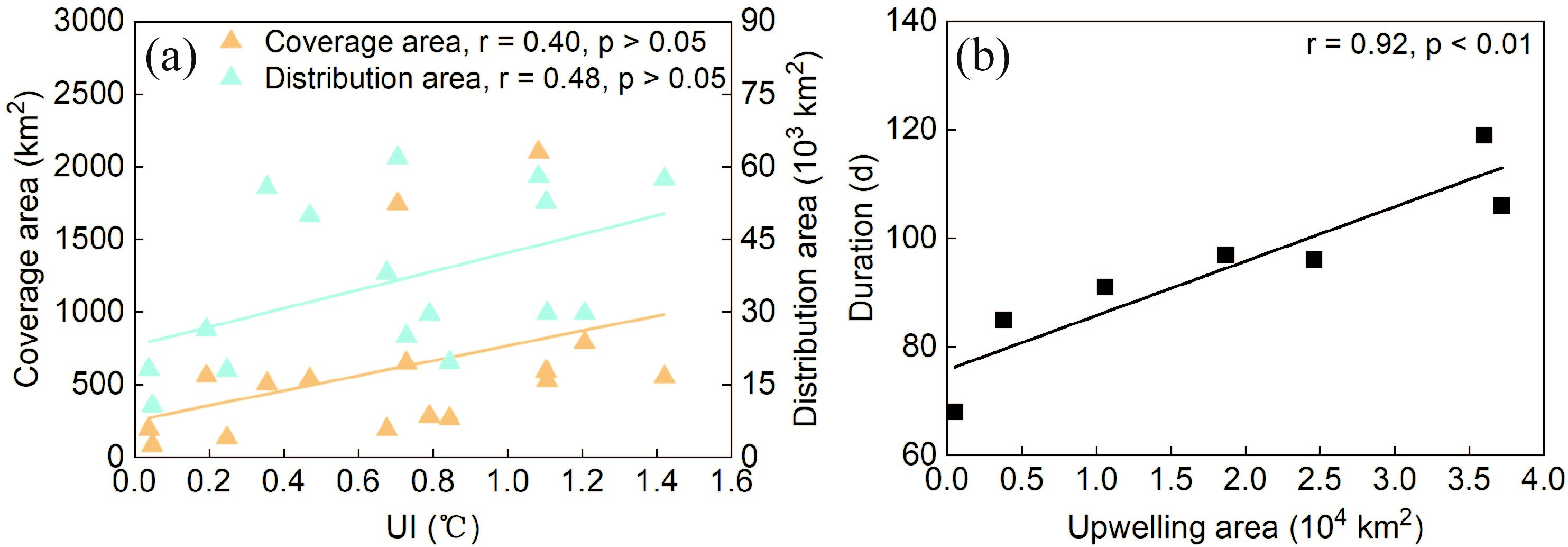 研究进一步发现,浒苔绿潮的最大覆盖和分布面积与锋面上升流指数(UI)呈正相关关系(覆盖面积:r = 0.40,p > 0.05;分布面积:r = 0.48,p > 0.05)(图1a)。2021年上升流指数(0.70°C)显著高于2022年(0.25°C),对应绿潮覆盖和分布面积也明显更大(2021年:1746 km2,61898 km2;2022年:135 km2,18002 km2)。上升流面积与绿潮持续时间呈显著正相关关系(r = 0.92,p < 0.01)(图1b)。2021年上升流面积(18700 km2)大于2022年(3800 km2),对应绿潮持续时间分别为97天和85天。这些结果表明,锋面上升流输运的营养盐对浒苔绿潮的发生和发展具有重要贡献,为大型藻华的暴发提供了必要的物质基础。