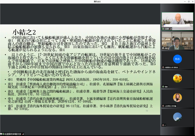 1030日上午,日本关西大学文学部名誉教授松浦章在线上为海大师生带来了一场题为“17-20世纪初期东亚海域航运史所见文化交流”的学术讲座。50余位校内外师生在线上参与了本次讲座,讲座由开云电竞网址文学与新闻传播学院院长修斌教授主持,山东师范大学杨蕾副教授同步翻译。
