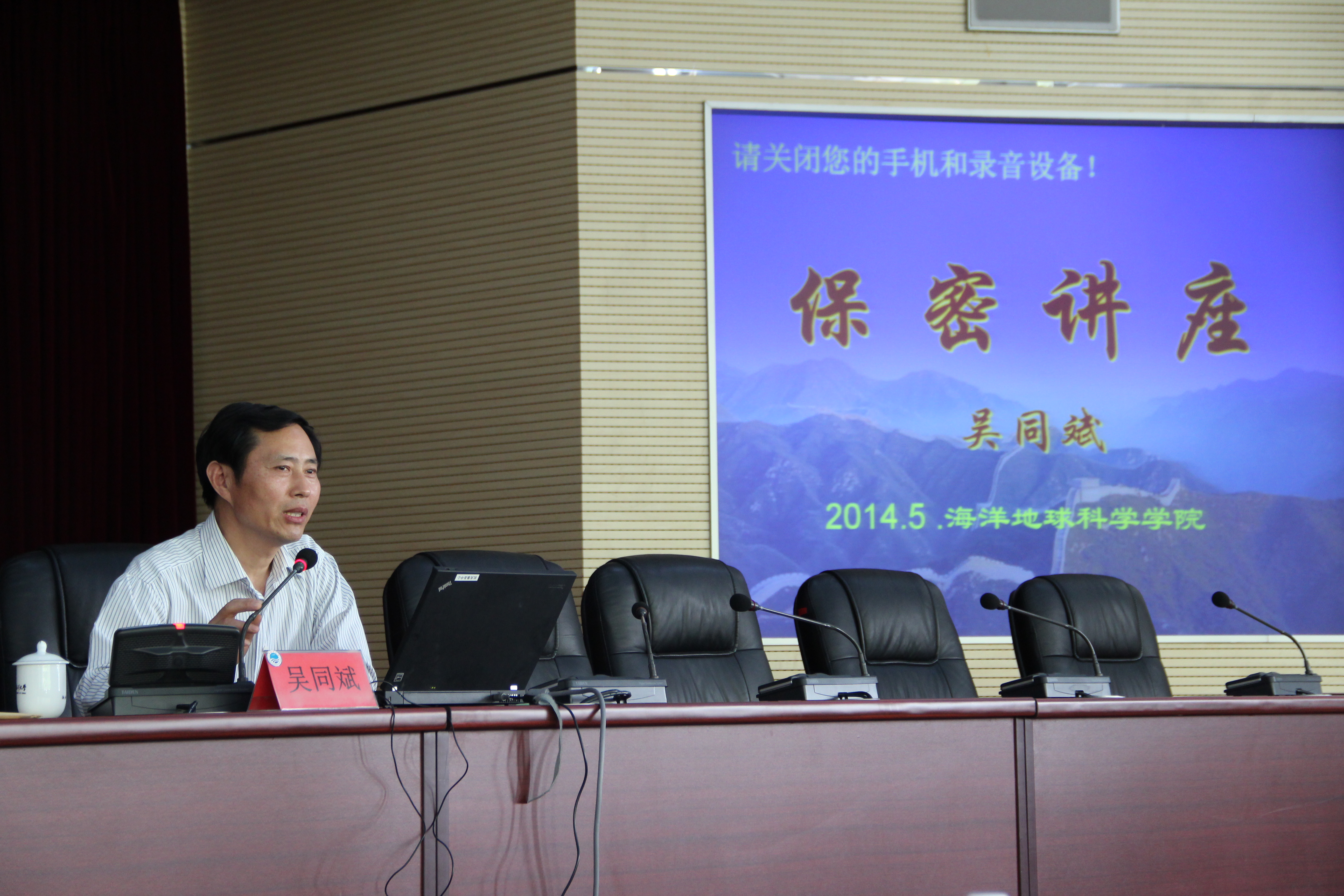 吴同斌首先介绍了毛泽东、邓小平、江泽民、胡锦涛和习近平国家几代领导人对保密工作的重视程度。后又从“棱镜事件”入手,强调了信息保密对于一个国家的重要性,提出现阶段保密工作依然十分严峻、依然易发多发、依然艰巨繁重的现状。引经据典地阐述了中国作为一个网络大国应该如何应对现阶段网络安全泄密,如何加强通讯设备的管理,针对优盘、手机、复印机、传真设备等的具体管理措施,以及加强部位管理做到“人防、物防、技防”等多重保障。最后,吴同斌根据学院的学科特点提出了几点针对性的保密工作要求,并希望学院师生能在今后的教学科研保密工作中提高认识、强化意识、掌握常识,切实做好海洋地球科学学院教学科研保密工作。会后,吴同斌在学院领导老师的陪同下参观了学院的保密室,在详细的了解了保密室的建设及使用情况后,为今后学院保密室建设工作的日趋规范和完善又有针对性地提出了非常宝贵的建设指导意见和建议。