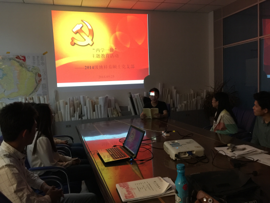 本站讯 为深入贯彻落实“学党章党规、学系列讲话,做合格党员”学习教育,进一步教育引导党员尊崇党章、遵守党规,以习近平总书记系列重要讲话精神武装头脑、指导实践、推动工作。5月23日下午,2014级地科系硕士党支部在海洋地球科学学院院楼开展了“两学一做”专题教育活动,党支部书记张勇和党员代表郑祺亮各自分享了学习心得与体会,全体党员、积极分子与部分同学参加了学习教育。