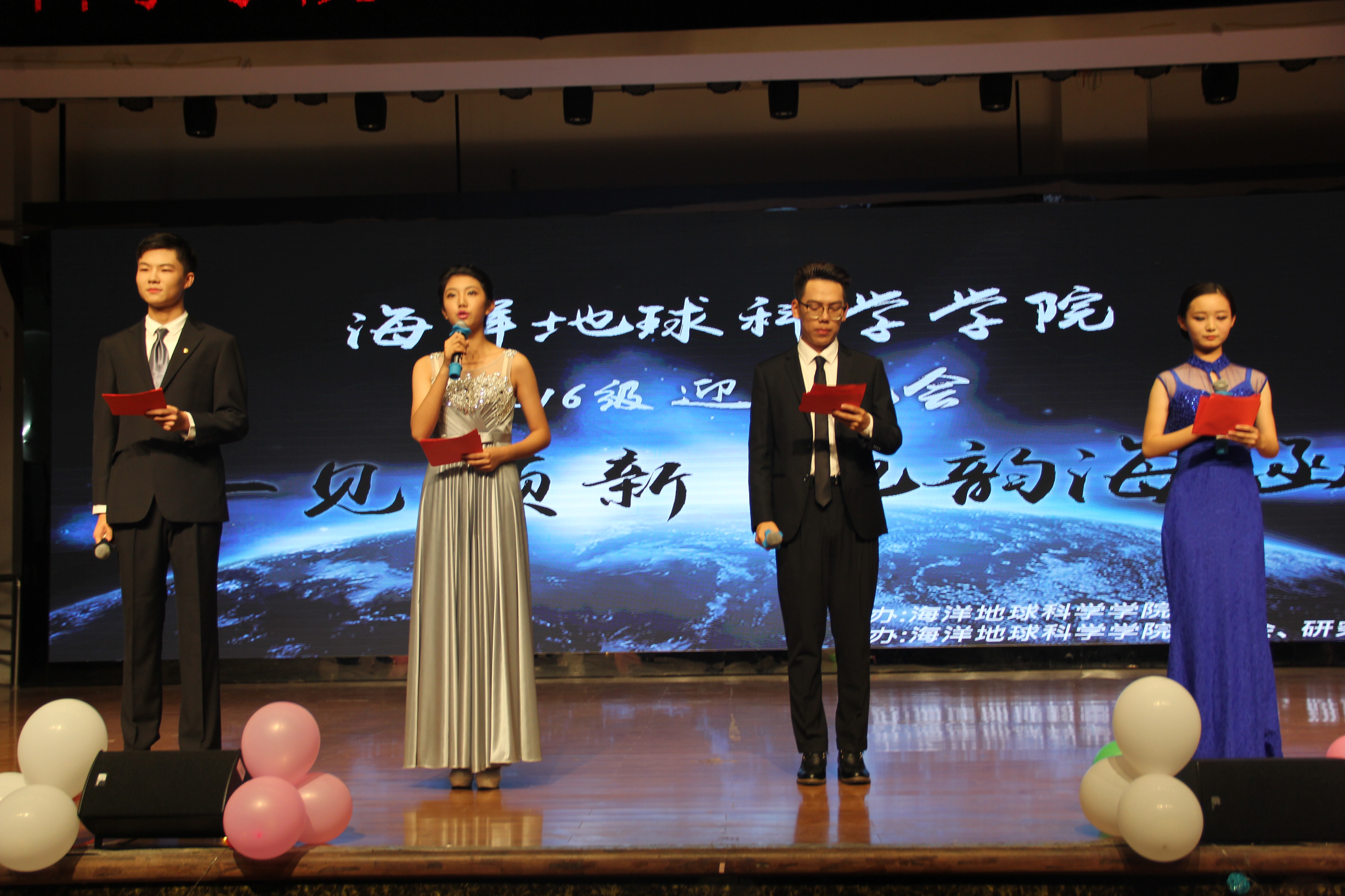 本站讯 10月8日晚,由海洋地球科学学院(以下简称地院)团委主办,地院学生会承办的“一见倾新 地韵海涵”迎新晚会在大学生活动中心多功能厅顺利举行。本次活动由地质学2016级张巍、曹芷琳、桑亚迪、勘查技术与工程(以下简称勘工)2016级臧虎临主持。本次晚会的嘉宾有地院党委副书记张殿镇、地院团委书记张婧、海洋与大气学院团委副书记高睿璇、信息科学与工程学院团委副书记李冉冉、化学化工学院团委副书记王晓鹏、地院团委副书记郭子悦、工程学院团委副书记朱富江、环境科学与工程学院团委副书记西国庚、经济学院团委副书记张圣雪、外国语学院团委副书记贾腾飞、文学与新闻传播学院团委副书记许春颖、法政学院团委副书记赵超、材料科学与工程系团委副书记张蔚圣、基础教学中心团委副书记宋济汉、管理学院团委老师吉力力地质学2016级班主任索艳慧老师以及校学生会、校研究生会各兄弟院系学生会、研究生会的主席们。