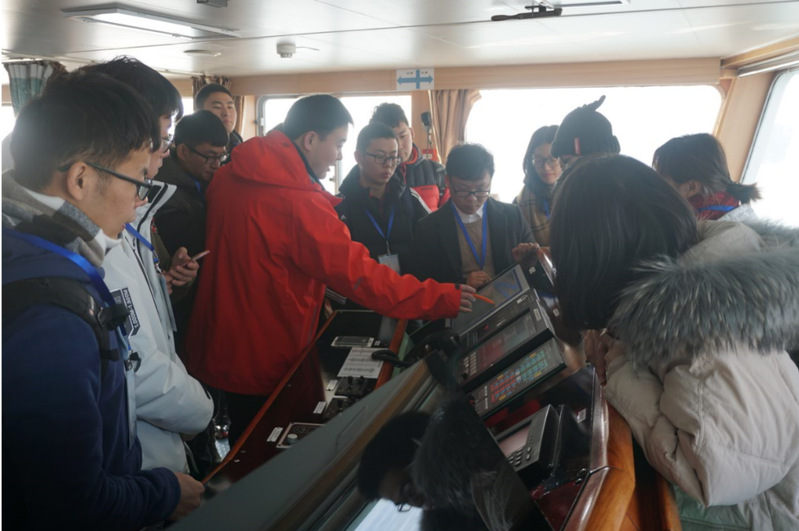 同学们首先来到“向阳红18号”科考船,据介绍,“向阳红18号”是我国1500吨级中最先进的海洋科考船,主要用于渤海、黄海、东海、南海等海域的海洋科考工作。在船长的带领下,同学们先后来到驾驶舱、实验室和轮机库,参观了先进的探测仪和各类电子海图。纸质海图到电子海图的变化,给海上航行带来了极大的便利。同学们认真聆听,积极提问,船长都给予了耐心的解答。