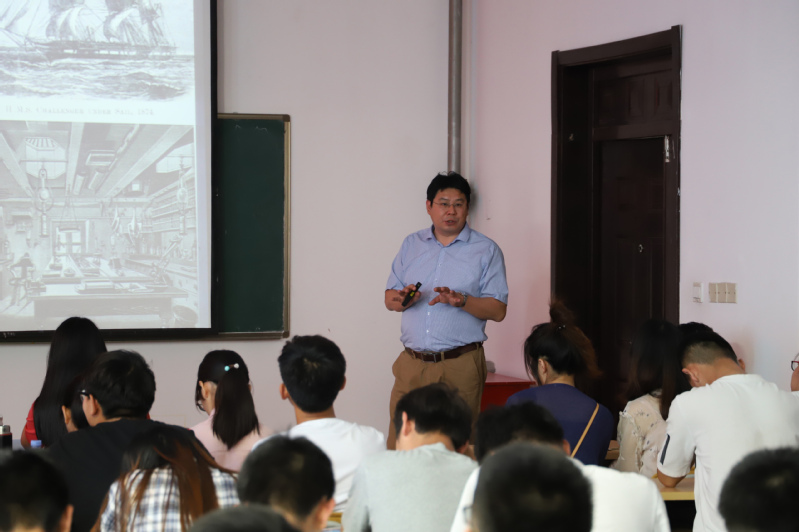 之后,王厚杰向大家讲述了人类探索海洋的历史。他从中国明朝的郑和下西洋说起,讲述了郑和七下西洋的原因以及对于明朝的影响,展现了海洋在对外交流中的重要作用。同时,他指出,由于后期的动乱和清朝的闭关锁国政策,导致了中国科学技术的落后,中国的航海技术从此落后于世界。他还结合世界历史上其他国家依托海洋兴盛的例子,使同学们真真切切地感受到海洋对于一个国家的重要性。