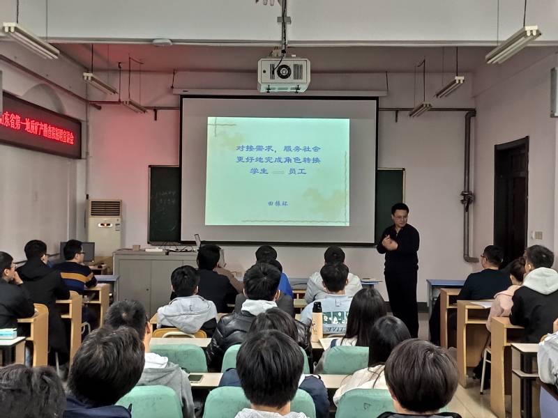 会议伊始,田振环首先对自身所在单位-山东省第一地质矿产勘查院的基本情况向在场同学做了简要介绍。交流会上,田振环从学校和职场、学生和职业人的差别出发,为在座同学讲解了大学生在向社会角色转变的过程中可能会遇到的问题。他表示,学校和职场环境不同导致了对学生和职场人的要求有着很大的差异,职场人相较于学生而言,对时间纪律性的要求更高、对人际交往能力要求更高、对心理承受抗压的要求也更高,大学生在校期间应注重这些能力的培养,以便于将来能顺利完成由大学生到职场人的身份转变。