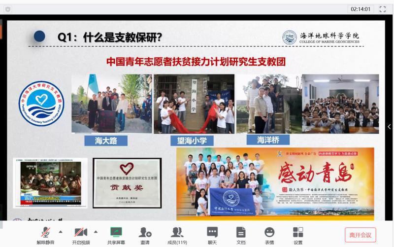 本站讯 3月19日,海洋地球科学学院研究生推免线上经验分享会召开,会上共有8名来自不同专业的学生依次为同学们分享经验、答疑解惑。会议由辅导员王可佳主持,130余名本科生参与。