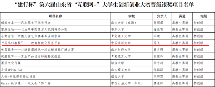 本站讯 近日,以“我敢闯,我会创”为主题的第六届山东省“互联网+”大学生创新创业大赛决赛于曲阜师范大学日照校区举行。本次大赛共142所高校、58所中职学校报名参赛,参赛项目11.86万,参赛学生36.25余万人,参赛学生人次达到55.82万,海洋地球科学学院“国鸣AI智校——教育智能化服务平台”项目在300项决赛作品中脱颖而出,斩获银奖,创学院历史最好成绩。