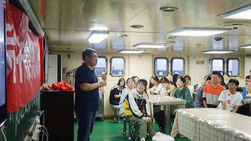 10月11日下午,在“东方红2”科考船上,海洋地球科学学院2017级全体同学在邢磊、刘勇、吴晓老师的带领下开展了一场特殊的“航行中的思政课”。