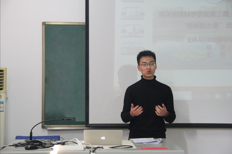 本站讯 12月3日下午,海洋地球科学学院第三期“青马工程”暨学生骨干培训班“榜样的力量”优秀学生骨干经验分享会于地质楼B206举行。本次经验分享会邀请到了三位优秀学生骨干,他们分别是来自文学与新闻传播学院的张卓越、经济学院的赵倩以及工程学院的林源。学院团委委员丁怡主持本次会议。