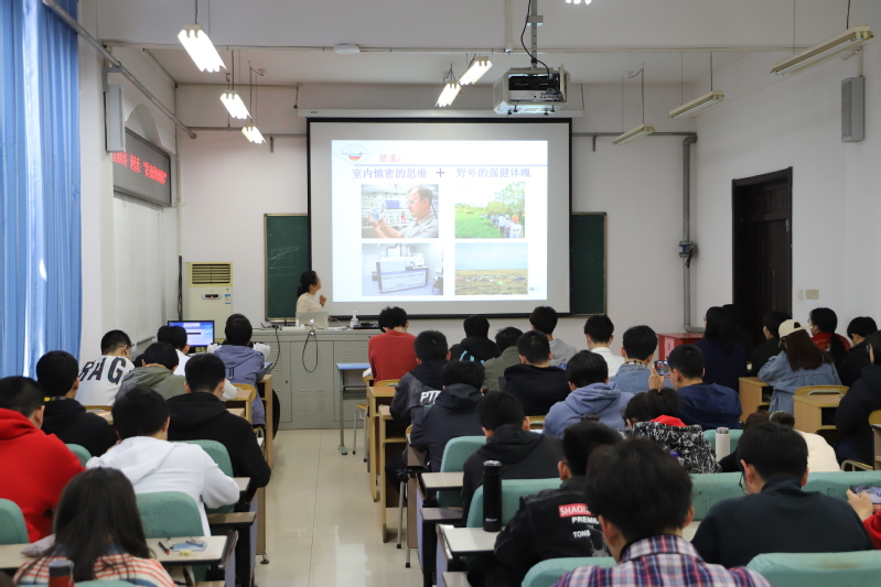 活动伊始,张殿镇对赵彦彦的到来表示热烈欢迎,并向学生们介绍了赵彦彦教授的研究方向及学术成果,随后活动正式开始。赵彦彦首先向同学们介绍了自己的学习经历,分享了从学生时代到现在成为研究员的成长经历,讲解了有关沉积地球化学、古沉积岩中所含的元素、古海洋、古气候和古环境的演化及其对生命的影响等相关知识,为同学们今后的专业学习埋下兴趣的种子。