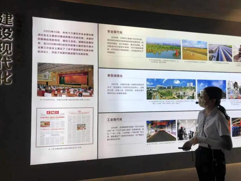 在讲解员的带领下,团队了解到永联村由围垦建村,到走上工业化,再到推进城镇化,建设现代化的发展历程。通过观看流媒体展示,成员们对永联村的发展有了更加深刻的认识。凭借着改革开放的政策支持,永联居民带着敢闯敢试的勇劲,从围田垦塘,粮渔双收足温饱;到向工业大胆迈步,小钢厂带来大收益;再到永钢集团茁壮成长,面临金融危机,风浪中转型自主炼钢,站稳脚跟全国领先:永联村民的奋斗史,是改革开放、机遇与风险并存时代的缩影。据了解,2010年前后永联村已经形成农业现代化,新型城镇化和工业现代化的三维发展格局。如今永联村已建成以花园工厂、小镇水乡、现代农庄为特色代表的现代化强村。永联村的发展与永钢集团密不可分:永联村集体持有有永钢集团25%的股份,这25%的股份每年为永联村带来稳定的1个亿的收入,是永联发展的底气所在。