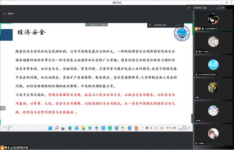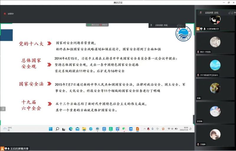 7月31日,“筑牢国家安全人民防线,喜迎党的二十大胜利召开”国家安全教育进社区普法现状调研与理论宣讲团面向山东省烟台市上刘家居委会于腾讯会议开展线上国家安全教育进社区理论宣讲活动,结合实际案例,系统的讲解国家安全体系涵盖的16种安全。本次宣讲由2021级地质学专业王欣主讲。