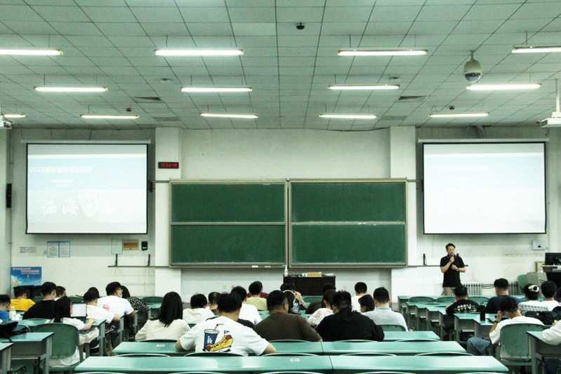 随后李坤伦就毕业生就业情况分析、就业管理服务、市场招聘服务和就业指导服务四个方面进行了阐述。通过近年海洋地球科学学院就业情况数据向大家说明了学院的就业率、就业态势、签约单位流向和地域流向分布。他表示要把握当下就业机会,先就业再择业。紧接着李坤伦详细地说明了就业派遣的时间、毕业派遣的规则、与用人单位的签约解约流程以及三方协议的相关知识并强调了准备就业所需各种材料的注意事项为毕业生们打下信息基础,提前做好准备。随后,他整理了校园招聘的各项信息和获取渠道,强调要把握校园招聘的“金九银十”,抓住机会,完善个人简历,主动出击,积极应聘。最后,李坤伦强调了找工作要充分认识自己,找到核心竞争力,调整心态,积极参与实践,善于寻找并抓住机会,有百折不挠的勇气与信心!