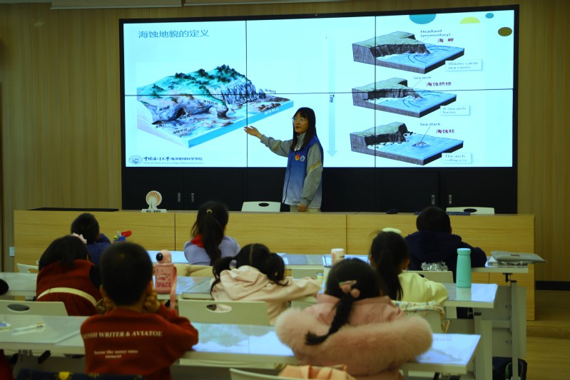 挂牌仪式后,来自海洋地球科学学院2021级地质学专业的金湘然和王欣两位志愿者分别就海洋生物、海蚀地貌两部分内容向现场20余名小朋友及家长开展科普课堂。志愿者们生动有趣的讲解吸引小朋友们不时互动交流,现场气氛活跃。