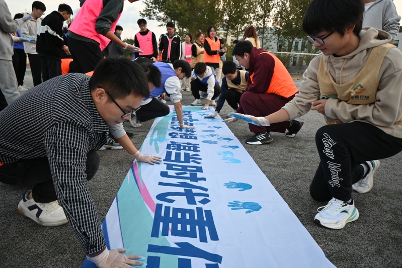紧张刺激的对抗赛落下帷幕,一场庄严而充满意义的仪式悄然上演。赛场上曾经的汗水与拼搏,在这一刻化作了同学们心中最坚定的信念。他们依次走上前,在“胸怀蓝色梦想 堪当时代重任”的横幅之上,用力印下自己的掌印。这不仅仅是一个个手掌的印记,更是每一位海大青年、每一位青年马克思主义者对未来充满期许的郑重承诺。愿每一位海大青年都能怀揣着蓝色梦想,勇敢地肩负起时代的重任,用实际行动为建设海洋强国贡献自己的力量。在这片蔚蓝的天地间,书写属于自己的青春篇章。