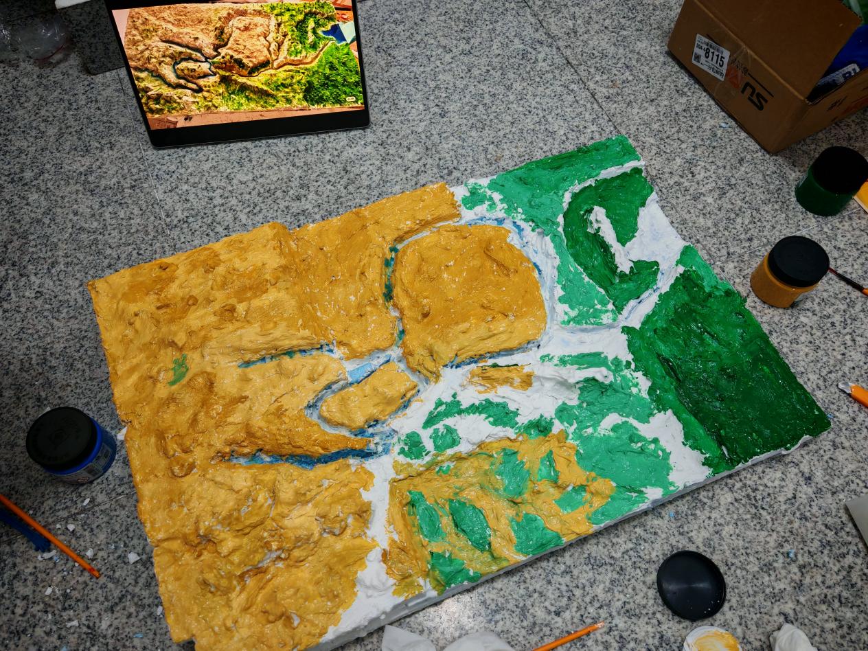 还有同学说到:“在没有尝试制作模型前,总是觉得那些作品并不容易完成,但只要动手去做,就会发现学以致用是一件多么快活而简单的事情,思绪随着双手的舞动在山河的胚土上一泻千里。看着自己双手下的黏土被塑造成山河的形状,染上江山的色彩,不单单让我为自己的动手能力感到有所成就,更是让我发自内心地觉得自己与这片土地的关系又亲密了几分。”
