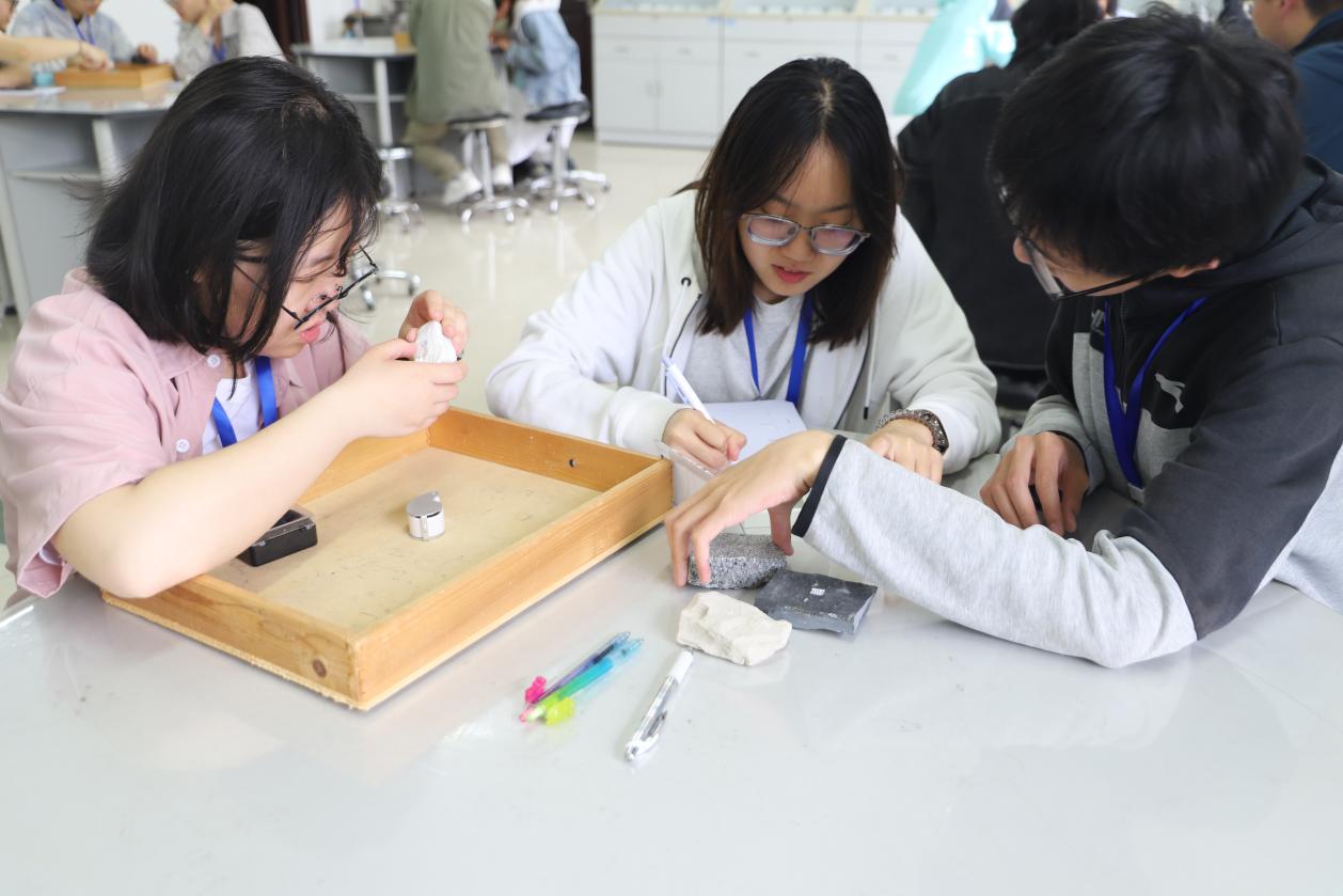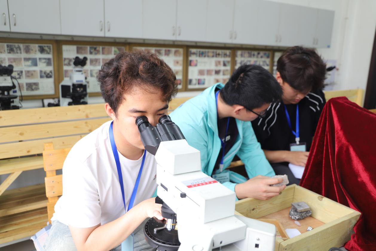 在地质标本鉴定环节,非专业组选手以小组为单位,用放大镜、磁铁、条痕板等工具对常见矿物、岩浆岩、沉积岩、变质岩进行鉴定;专业组选手们运用偏光显微镜等工具,观察岩石标本和镜下特征,结合所学知识,鉴定矿物、分析岩石结构构造、定名并分析岩石成因,完成鉴定报告。