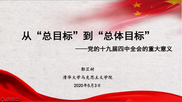 之后,清华大学马克思主义学院郭芷材向全体研究生会成员进行分享汇报,分享主题为从“总目标”到“总体目标”。郭芷材结合党的十九届四中全会精神,从“总目标”到“总体目标”的升华、中国特色社会主义制度理论的完善和发展以及实现社会主义现代化三个要点切入,针对制度自信以及国家治理现代化两个方面,从马克思主义的角度进行了深入浅出的讲解与分享,并就与会成员提出的问题进行了详细的解答。