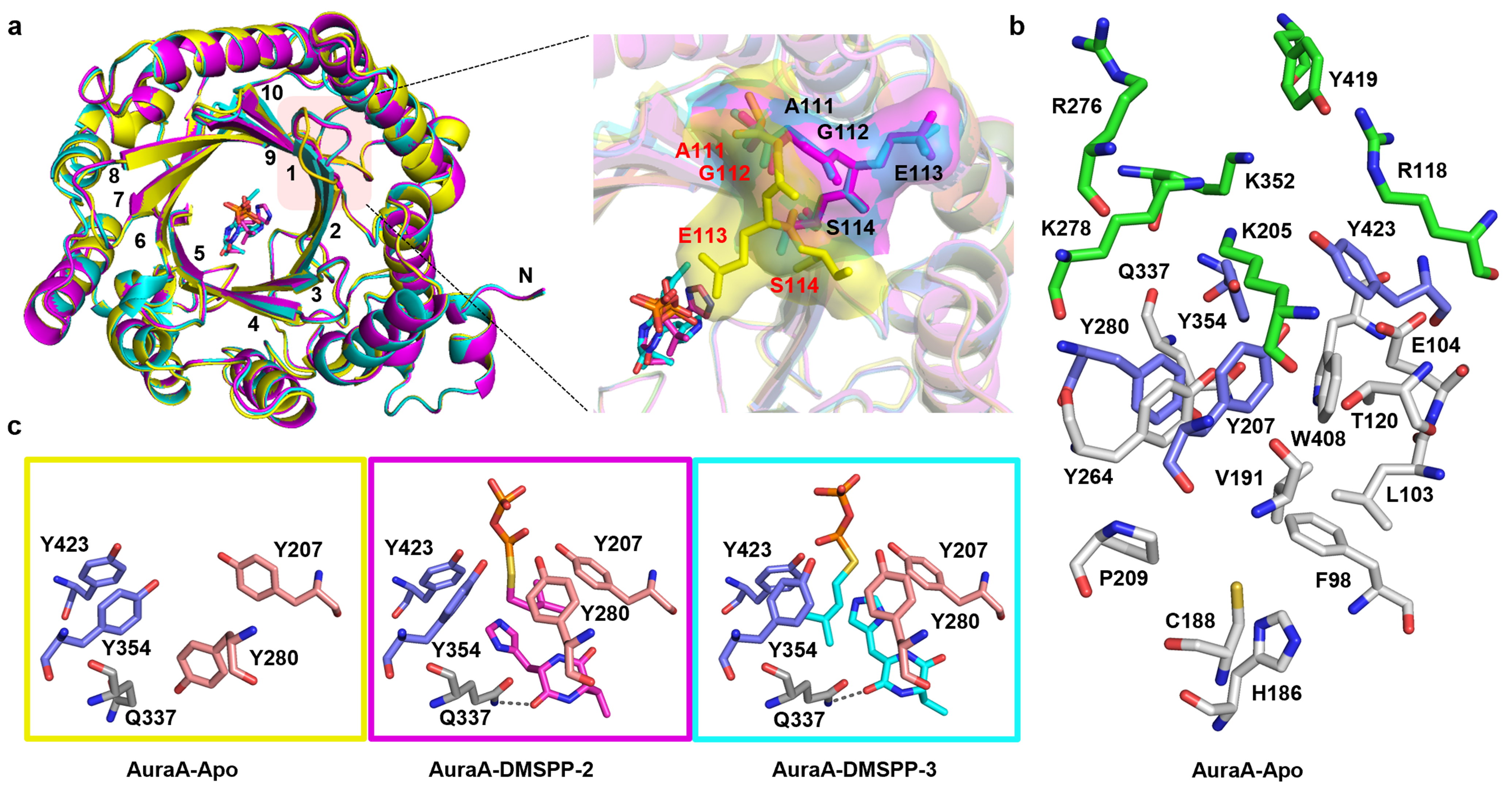 鉴于AuraA能基于单键/双键不同的相似底物催化位置(2位和5位)和模式(顺式和反式)不同的异戊烯基化反应,为精确阐明其催化机制,研究人员应用冷冻电镜技术,解析了AuraA及其2个三元复合物的结构(AuraA-DMSPP-2和AuraA-DMSPP-3),并系统分析了催化口袋内残基的构象变化及底物结合模式(图2),提出了异戊烯基供体与受体的相对位置及距离是影响催化模式的关键,阐明了AuraA催化咪唑基异戊烯基化的结构基础及催化选择性的分子机制。在此基础上,为提高该酶催化能力,研究人员对该酶进行了工程化改造,结果表明几乎所有突变体都发生了产物多样性的改变,尤其是位于酪氨酸屏蔽区的AuraA-Y207A突变体能高效率催化cyclo-(L-Val-DH-His)产生C2位顺式异戊烯基化产物viridamine(5)(图1)。同时,该突变体冷冻电镜的分析结果为拓展该类化合物的底物多样性奠定了结构基础。该项研究为咪唑小分子药物烷基化修饰提供了新的可用酶工具,同时为DMATS家族酶的识别催化机制和工程化改造提供了可靠的结构见解。
