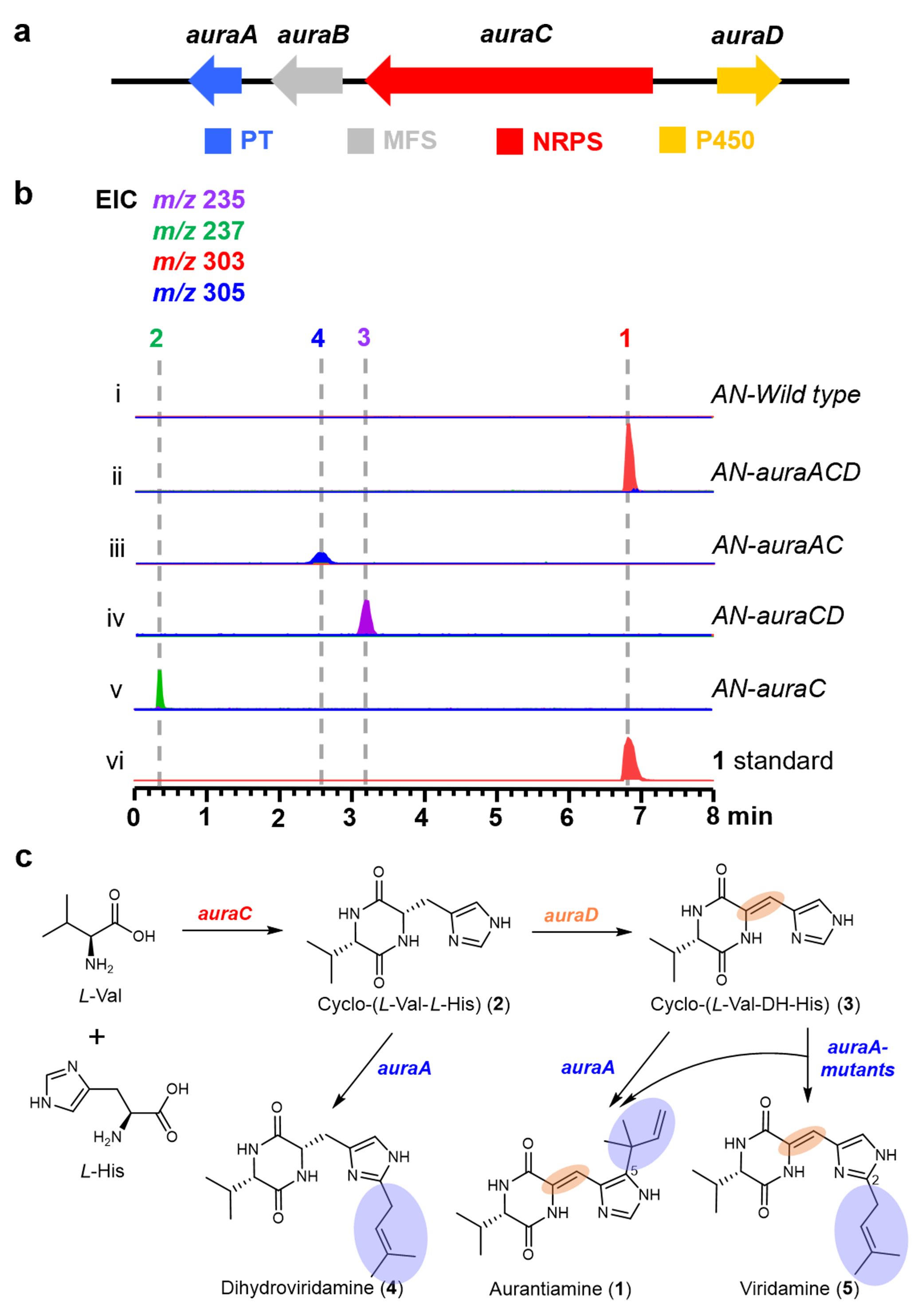 研究人员在对一株海洋来源真菌Penicillium solitum HDN11-131中的沉默基因激活过程中,获得了具有咪唑-C5-反式二甲基烯丙基化的DKP化合物aurantiamine(图1)。为深入研究咪唑基异戊烯基化过程,首先在P. solitum HDN11-131中鉴定了aurantiamine (1)的生物合成基因簇aura,该基因簇含有编码DMATS家族PT(AuraA)、MFS转运蛋白(AuraB)、双模块NRPS(AuraC)和P450单加氧酶(AuraD)的相关基因。利用Aspergillus nidulans进行系统的异源表达,阐明了aurantiamine (1)的生物合成途径,并在含有auraA和C基因的异源株AN-auraAC中发现了AuraA催化咪唑-C2-顺式异戊烯基修饰的新取代模式产物dihydroveridamine (4)。体外酶学实验确认了AuraA既能催化咪唑的脱氢环二肽cyclo-(L-Val-DH-His)生成咪唑-C5-反式异戊烯基化产物1,也能催化环二肽cyclo-(L-Val-L-His)生成咪唑-C2-顺式异戊烯基化产物4(图1)。