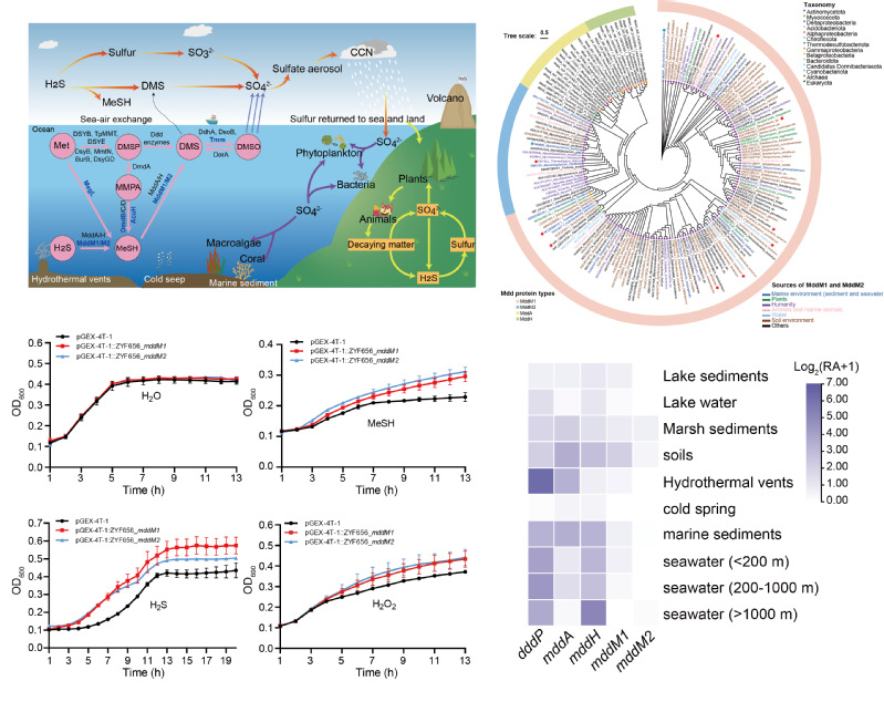硫化氢(Hydrogen sulfide,H2S)、甲硫醇(Methanethiol,MeSH)和二甲基硫(Dimethylsulfide,DMS)是海洋中主要的含硫气体,在全球硫循环、趋化作用及气候调节中发挥关键作用。微生物可通过S-甲基化作用将具有细胞毒性的H2S和MeSH转化为无毒的DMS,该过程在陆地与海洋环境中分别主要由MddA或MddH酶催化完成。然而,海洋和陆地中广泛分布的放线菌门细菌含有未知的Mdd酶,导致该代谢途径的潜力长期被低估。