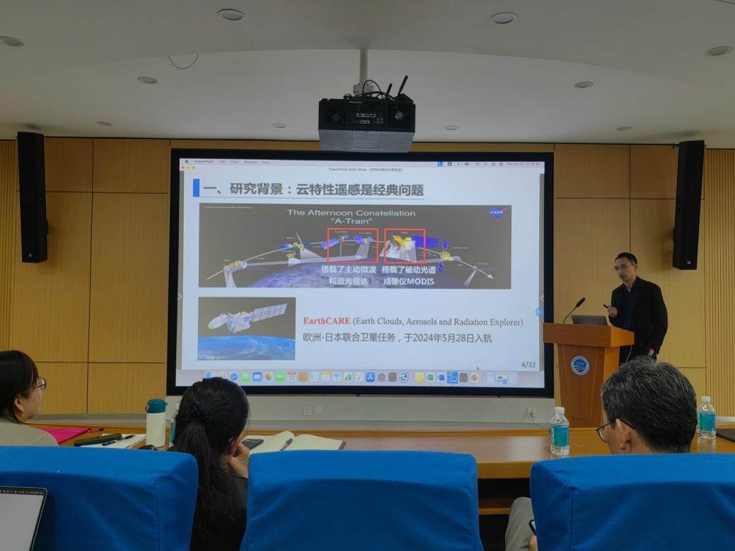 随后,刘超教授作了题为“云特性卫星光谱遥感:基础算法到科学应用”的学术报告。报告围绕“新一代光谱成像仪2.25微米通道的设置能否为云特性遥感带来新机遇”这一核心问题展开。刘教授首先从大气复杂冰晶粒子建模出发,系统介绍了FY-RTM辐射传输模式及其辐射仿真,并分享了自主研发的云光学和微物理参数反演算法在风云系列气象卫星中的业务化应用。刘教授指出,在算法研发过程中发现1.6和2.25微米通道的联合在云垂直结构探测中表现优异,可以显著区分冰相和液态水相云,进而创新性地提出了重叠云识别与特性反演算法。新算法的提出也增强了我们对云垂直结构的认识。