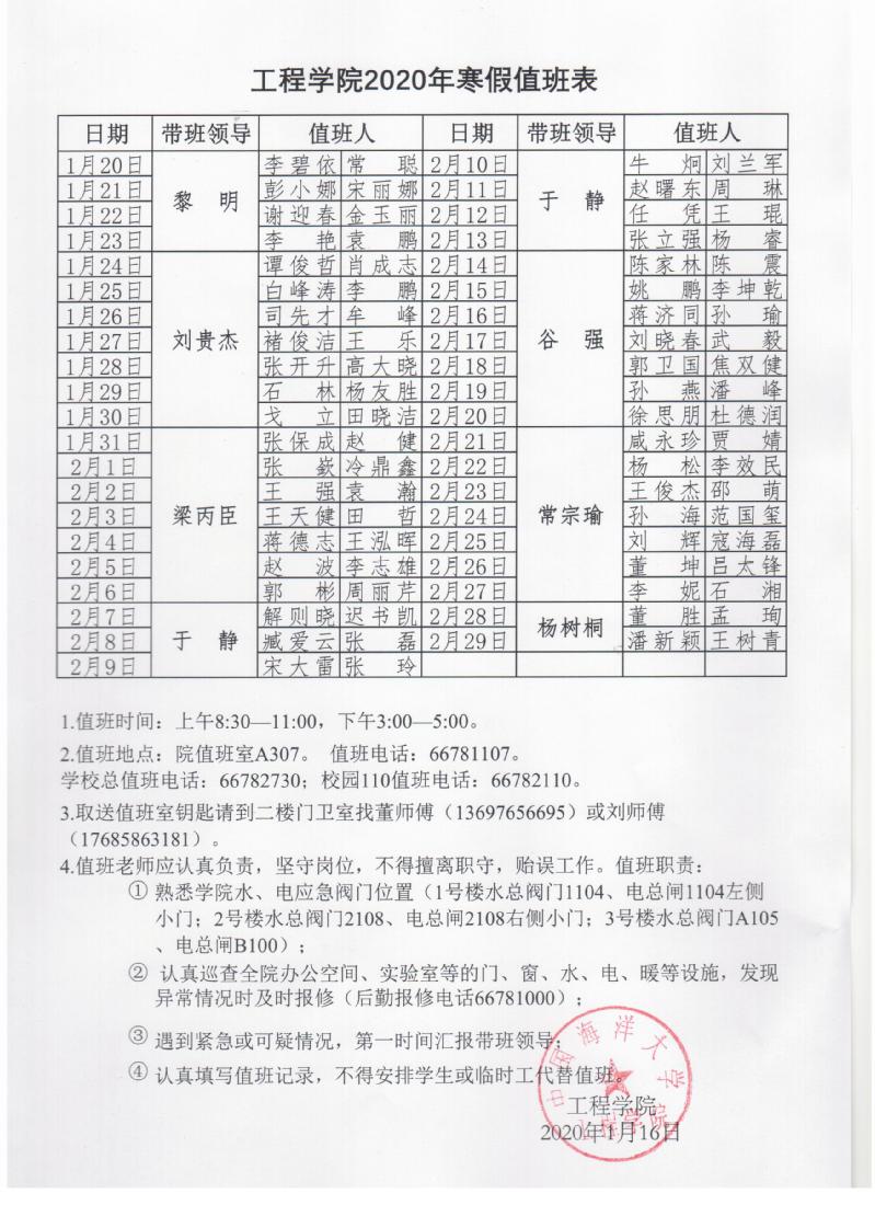 工程学院2020年寒假值班表