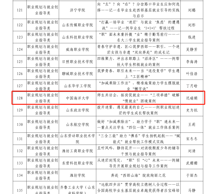 2025年4月2日,中共山东省委教育工委公布了2024年全省高校辅导员工作创新项目拟获奖名单。工作室成员迟瑞娟、周熠、王译萍共同撰写的案例《师生共访企,拓岗促就业——“三项举措”破解“慢就业”困境案例》荣获辅导员工作优秀案例三等奖。