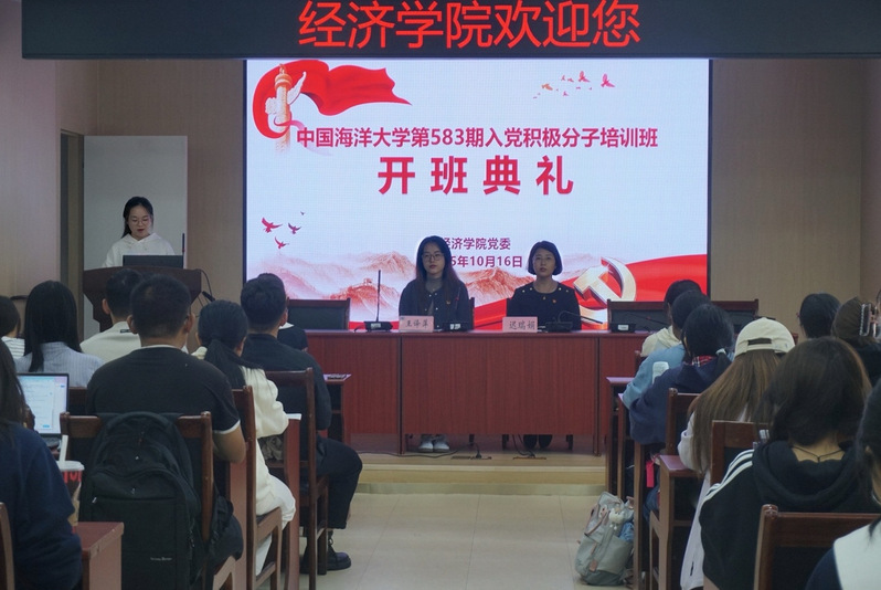 开班典礼在《国际歌》中拉开帷幕,全体学员肃立。随后,迟瑞娟发表致辞。她结合新时代使命要求,向学员们阐明了本次培训的重要意义。迟瑞娟对全体学员寄予殷切期望,她勉励大家要努力成长为胸怀蓝色梦想,堪当时代重任的优秀人才。此外,她还宣读了第583期入党积极分子培训班学员名单和分组情况。王译萍介绍了开班计划和学习要求,本期培训班采取课堂教学、研讨教学、实践教学等方式,将线下集中授课与个人线上自学课程相结合,对积极分子进行体系化、规范化的培训。培训班学员代表、经济学院2025级经济学班本科生董晓凡同学进行了发言。她表示将以此次培训为契机,认真学习、积极思考,不断提高思想觉悟和政治理论水平,积极向党组织靠拢,在学习和生活中发挥先锋模范作用,争取早日成为一名合格的共产党员。