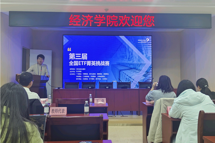 东方财富市场部山东区域经理张鑫对《第三届全国ETF菁英挑战赛》进行了赛事宣讲。他详细介绍了大赛背景、报名流程、赛事规则以及比赛奖励,激发了同学们的参赛热情。
