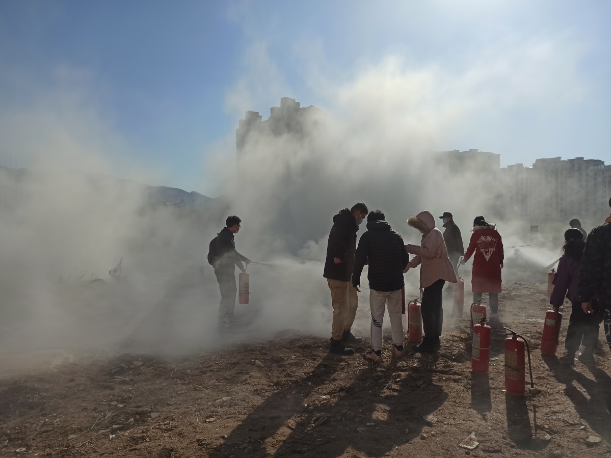 演练结束后,世园消防救援中队消防员为参演师生员工现场讲解干粉灭火器使用方法,师生员工实地体验了干粉灭火器的使用。