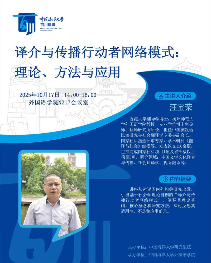 讲座预告| 汪宝荣教授:译介与传播行动者网络模式:理论、方法与应用
